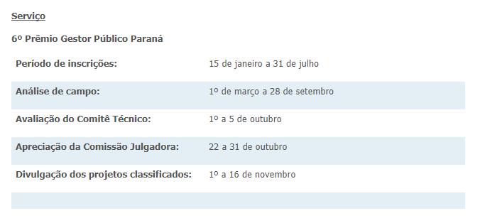 O prêmio é uma iniciativa do Sindicato dos Auditores Fiscais da Receita do Estado do Paraná (Sindafep-PR) que, além de reconhecer os serviços públicos de qualidade, possibilita que outras administrações municipais se inspirem em projetos inovadores. As inscrições para o 6º PGP-PR ficarão abertas até 31 de julho.